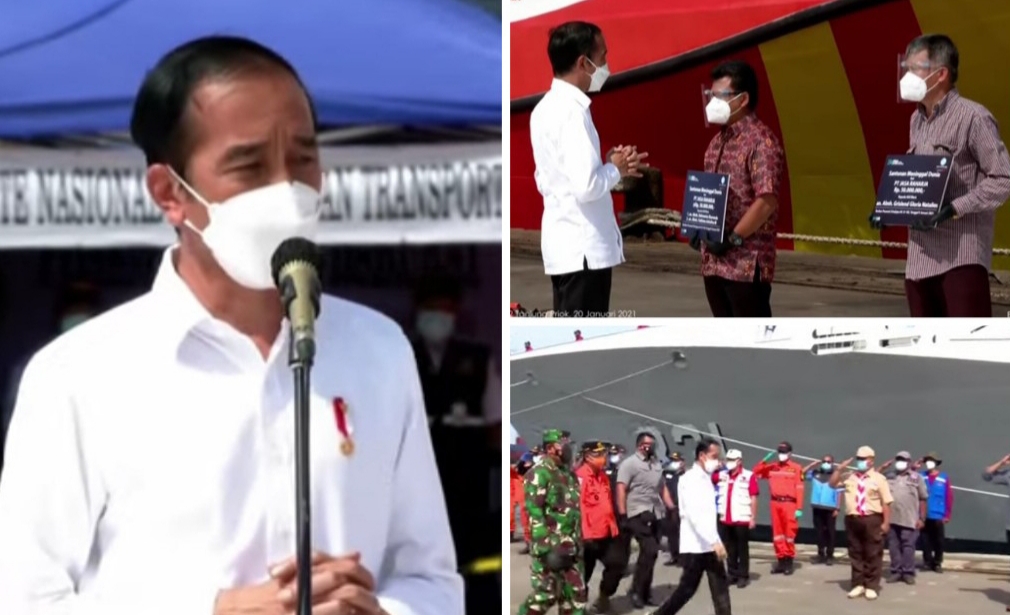 Kunjungan Presiden Jokowi di JICT, didampingi Menteri Perhubungan (Menhub) Budi Karya Sumadi, Panglima TNI, Hadi Tjahjanto, Kapolri Jenderal Idham Azis di sambut para pejabat setempat termasuk Kepala Basarnas Marsma TNI Bagus Puruhito, Kepala Staf Angkatan Laut (KASAL), Laksamana TNI Siwi Sukma Adji,