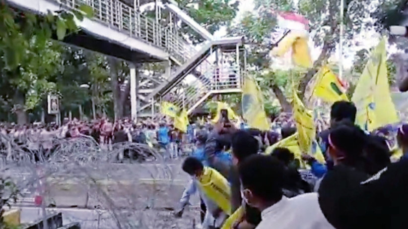 Sebelumnya, demo massa beratribut PMII memanas. Massa menjebol kawat berduri lalu dorong-dorongan dengan polisi.